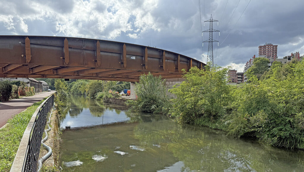 These are two 35-meter-long steel decks, each weighing approximately 135 tons, designed respectively for the tramway line and for road traffic. The bridges were lifted and installed in a single hoist using a large-capacity lattice boom mobile crane.