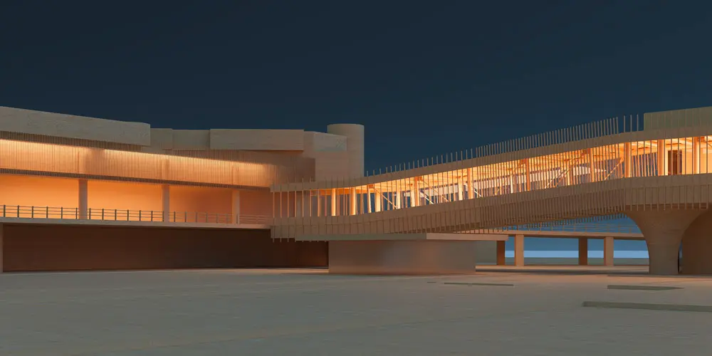 Per il percorso sopraelevato del Moving Walkway, è stato scelto uno schema a trave Mohniè per le pareti portanti, in quanto più efficiente in termini di peso strutturale.